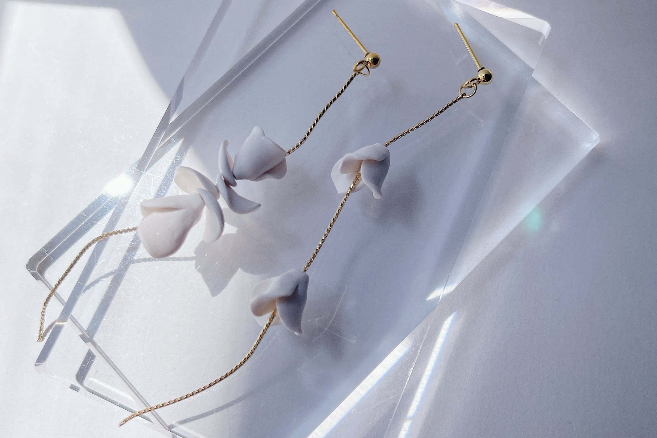 volant ピアス/イヤリング 花びらをあしらったふんわり柔らかな イメージのピアス/イヤリング とても軽量なので つけやすくおすすめです。 ピアスポスト/サージカルステンレス 全長約3.2cm イヤリング/サージカルステンレス 全長約3.2cm 1点1点お花のパーツから製作しております。 研磨仕上げをしておりますが、 素材の特性上、小さなキズや歪みなどある場合もございますので予めご了承くださいませ。