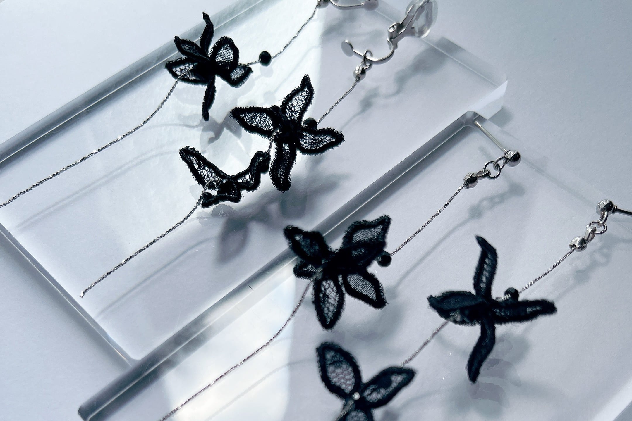 ✴︎受注製作✴︎3日間 broderie volant ピアスorイヤリング カラー:black 刺繍枠とオーガンジーを使ったbroderieシリーズ。 オーガンジー刺繍と花びら型のレースを合わせて ふんわりと立体感あるデザインに仕立てました。 着け心地はとても軽く、 どんなお洋服にも合わせやすいデザインです。 ピアス:ステンレス イヤリング:サージカルスステンレス